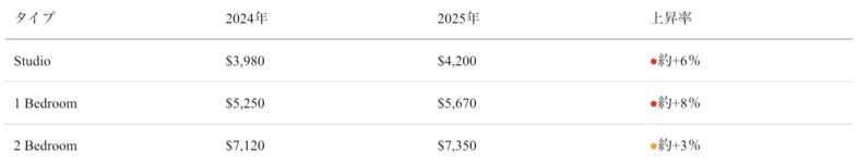 | 賃料目安 | Studio:$3,500〜$5,000 1 Bedroom:$4,500〜$6,000 2 Bedroom:$5,500〜$9,000 |