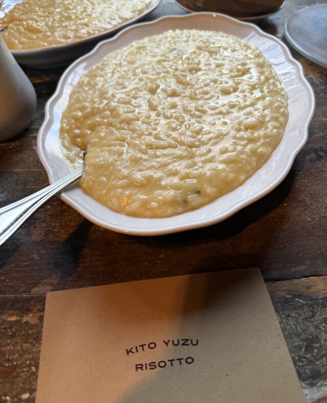 イベントではまず参加者に木頭ゆずを使った料理やドリンクが振る舞われた。一段と目を引いたのはこのリゾットだ。木頭ゆずをふんだんに使用し、鮮やかな黄色の木頭ゆずリゾットは、シンプルだが芳醇な香りが漂う非常に味わい深い一品。